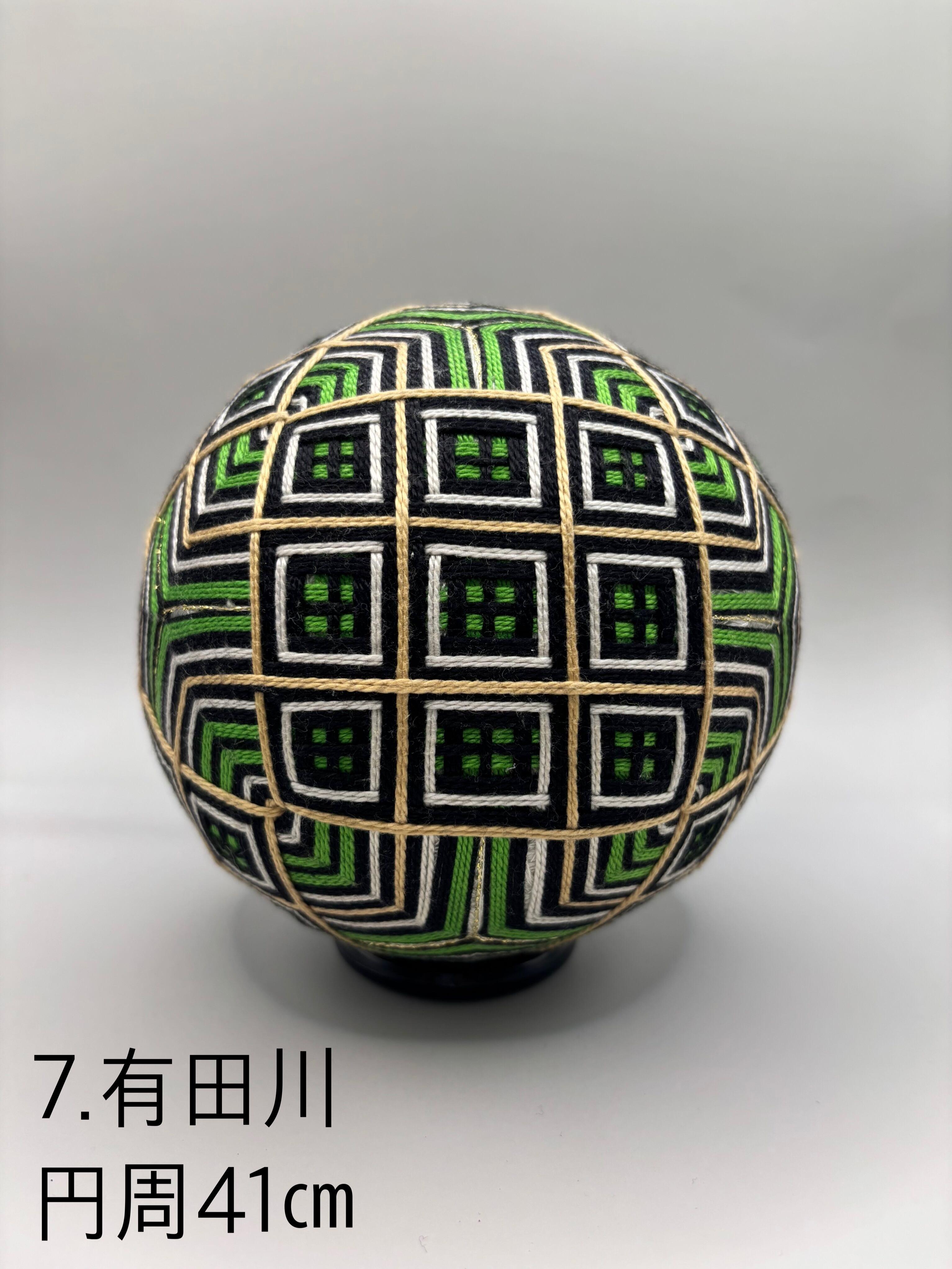 てまり糸で作られたこの作品は、円周約41cmの大きさで、有田川の美しさを表現した洗練されたデザインが特徴です。伝統的な日本の手芸技術を用い、優雅さと繊細さを兼ね備えた作品となっています。