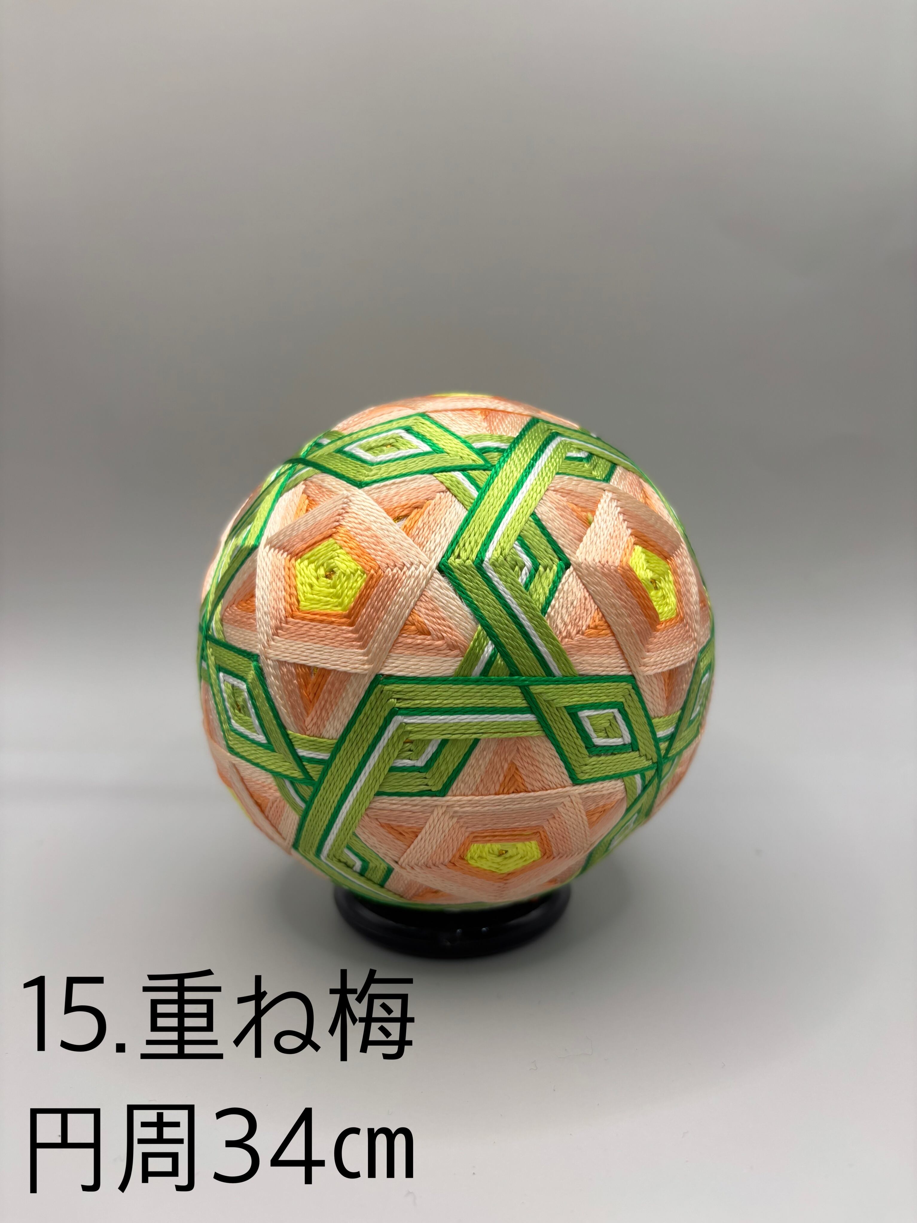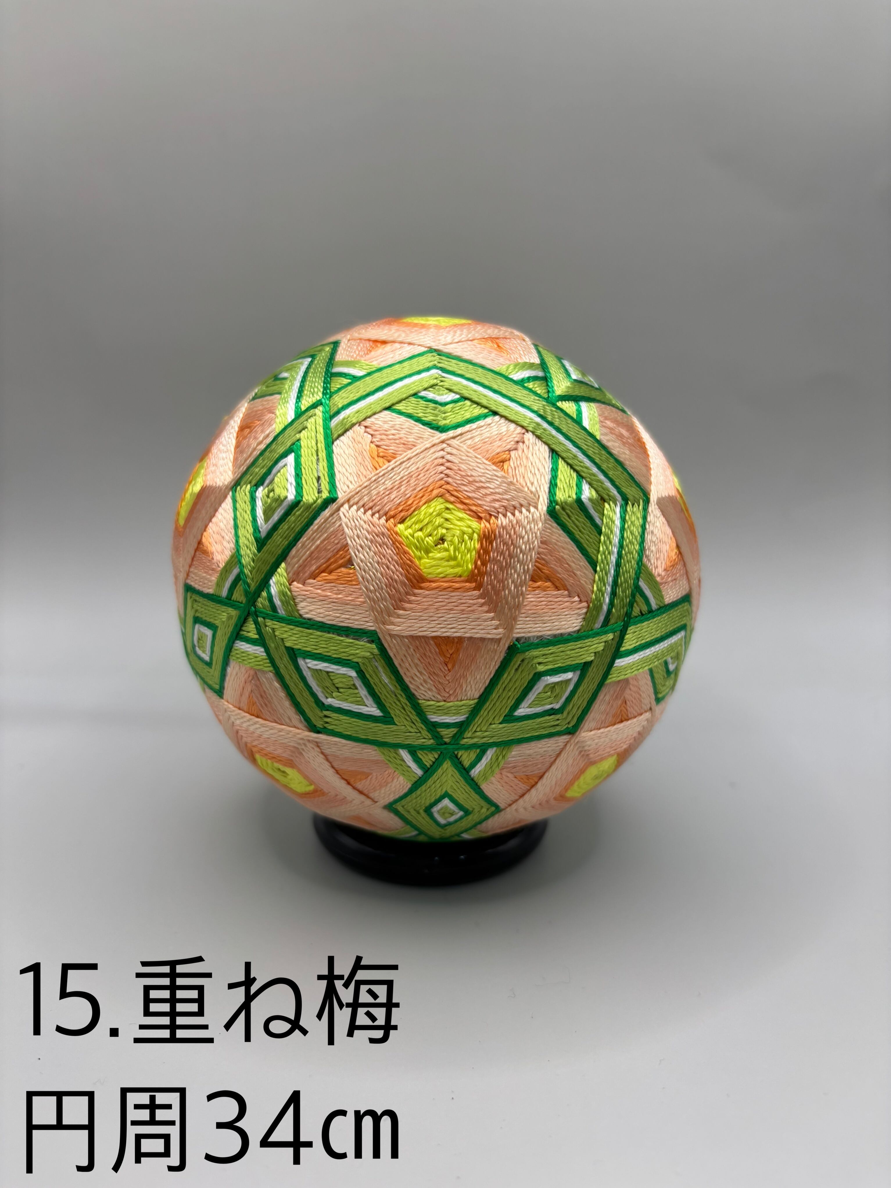 てまり糸で作られたこの作品は、円周約34cmの大きさで、梅の重なり合う美しさを表現した洗練されたデザインが特徴です。伝統的な日本の手芸技術を駆使し、優雅さと繊細さを兼ね備えた作品となっています。