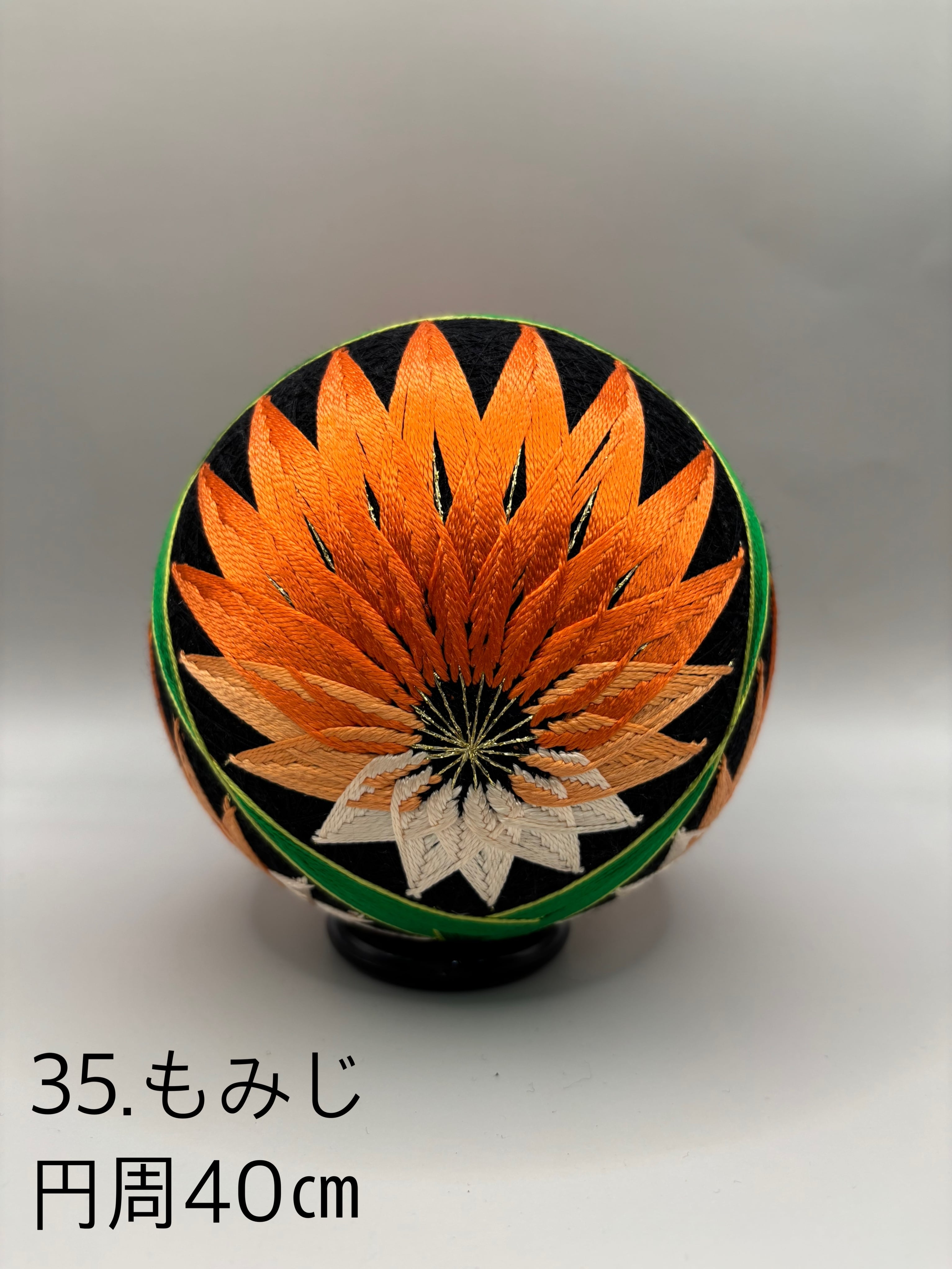 てまり糸で作られたこの作品は、円周約40cmの大きさで、紅葉の美しい色彩をモチーフにしたデザインが特徴です。伝統的な日本の手芸技術を駆使し、もみじが持つしなやかさと自然美を表現した作品となっています。