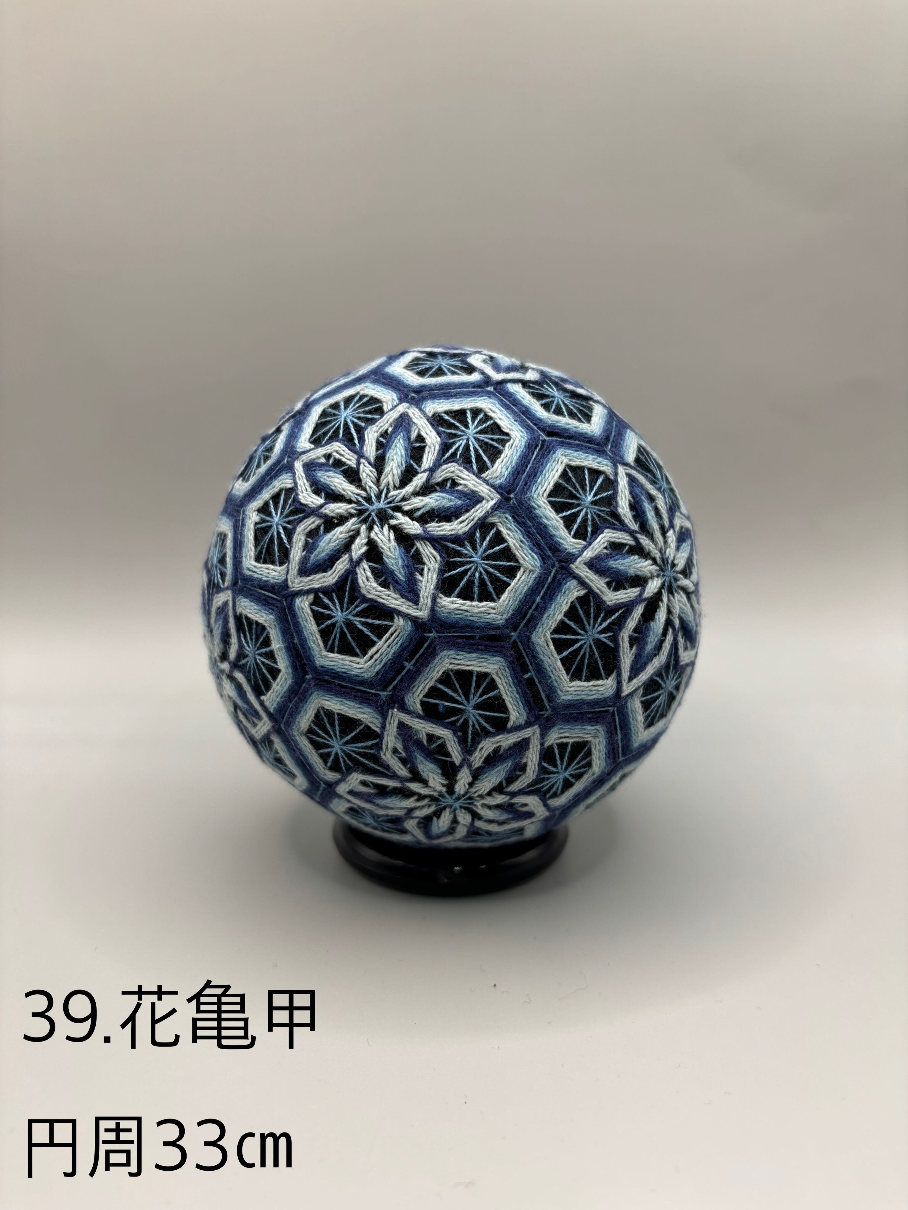 てまり糸で作られたこの作品は、円周約33cmの大きさで、亀甲模様をモチーフにした美しいデザインが特徴です。伝統的な日本の手芸技術を駆使し、亀甲が持つ安定感と永遠を表現した作品となっています。