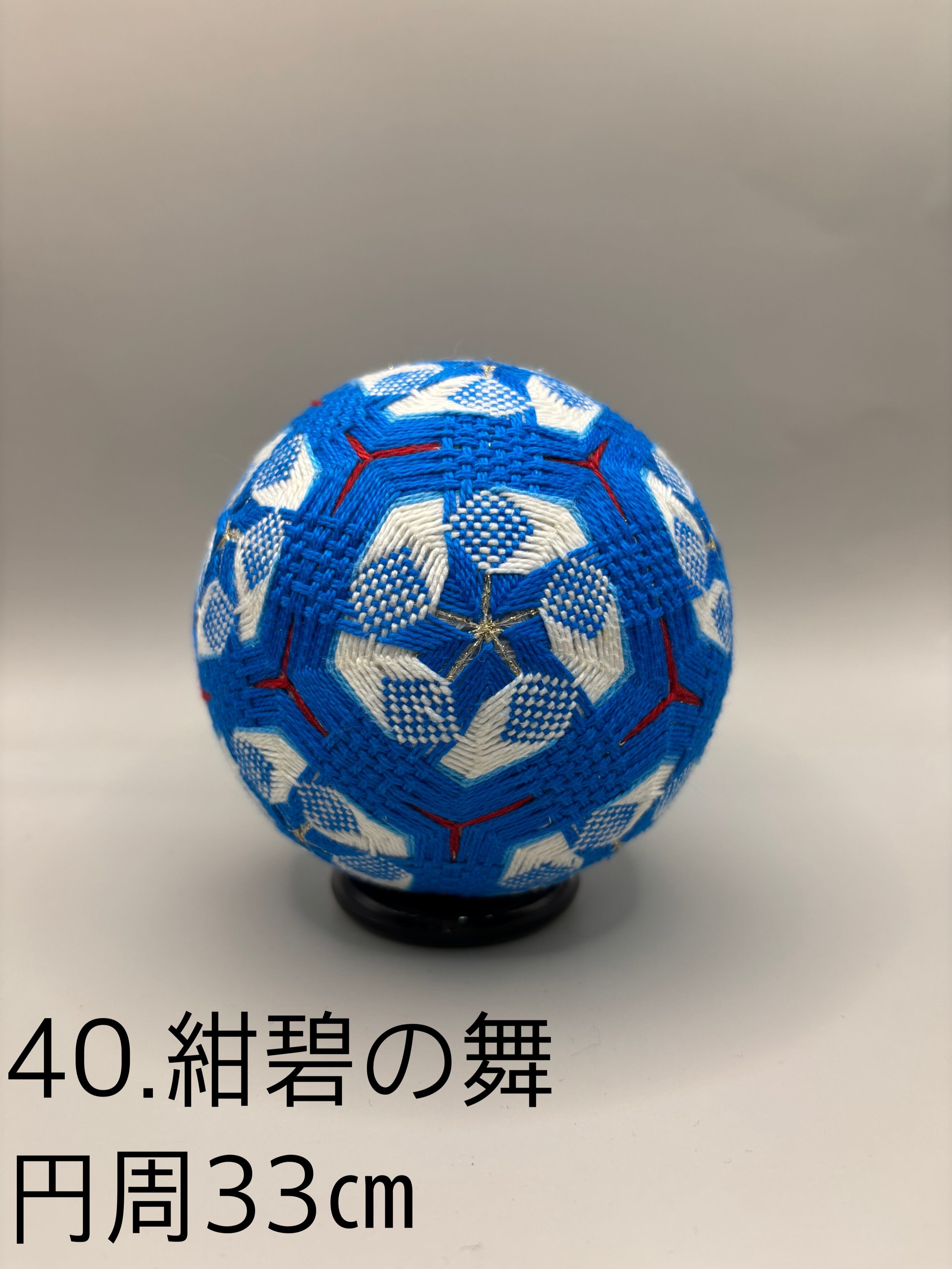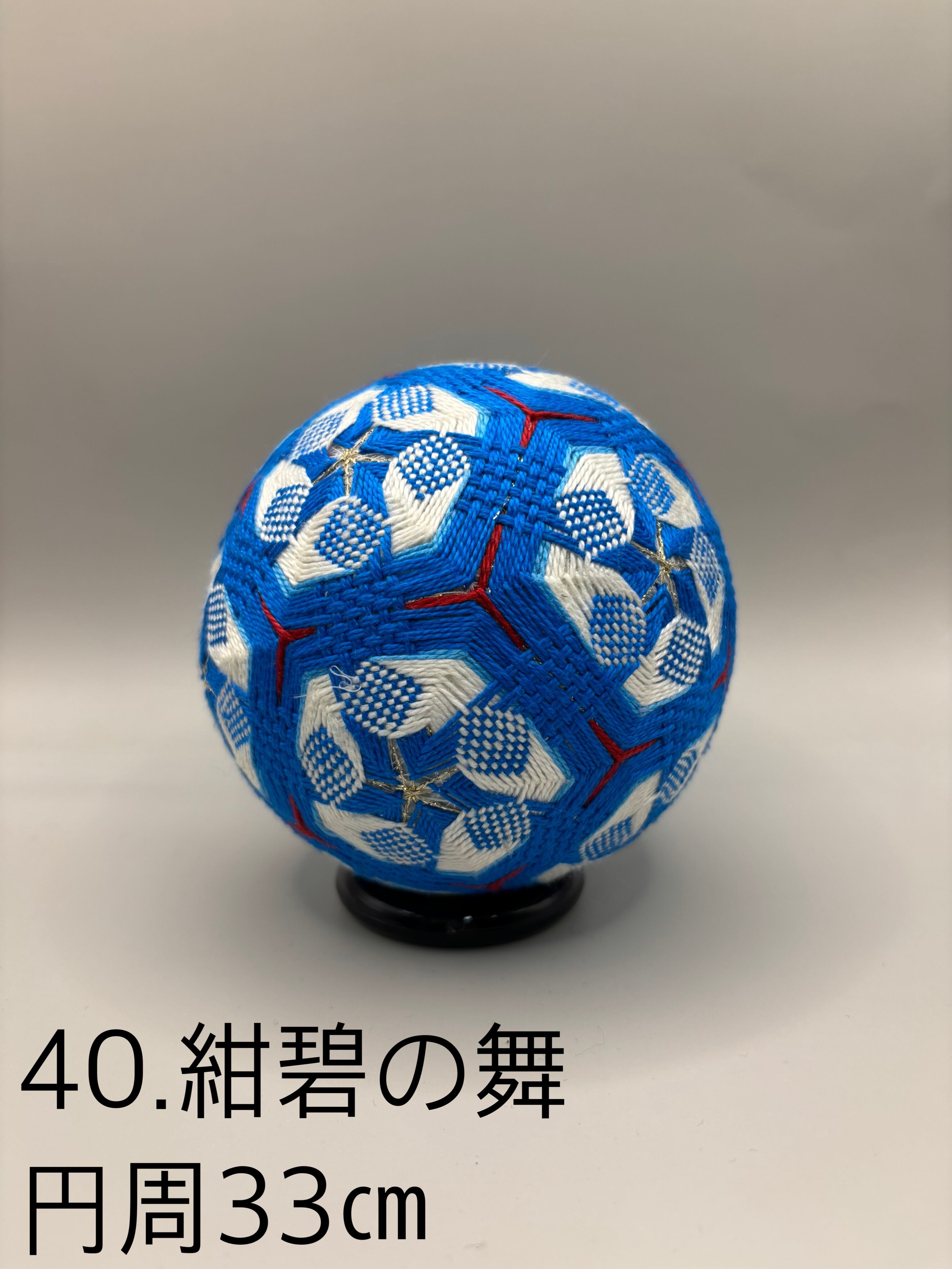 てまり糸で作られたこの作品は、円周約33cmの大きさで、美しい紺碧の色合いと流れるような舞のデザインが特徴です。伝統的な日本の手芸技術を駆使し、紺碧の舞が持つ優雅さと静けさを表現した作品となっています。