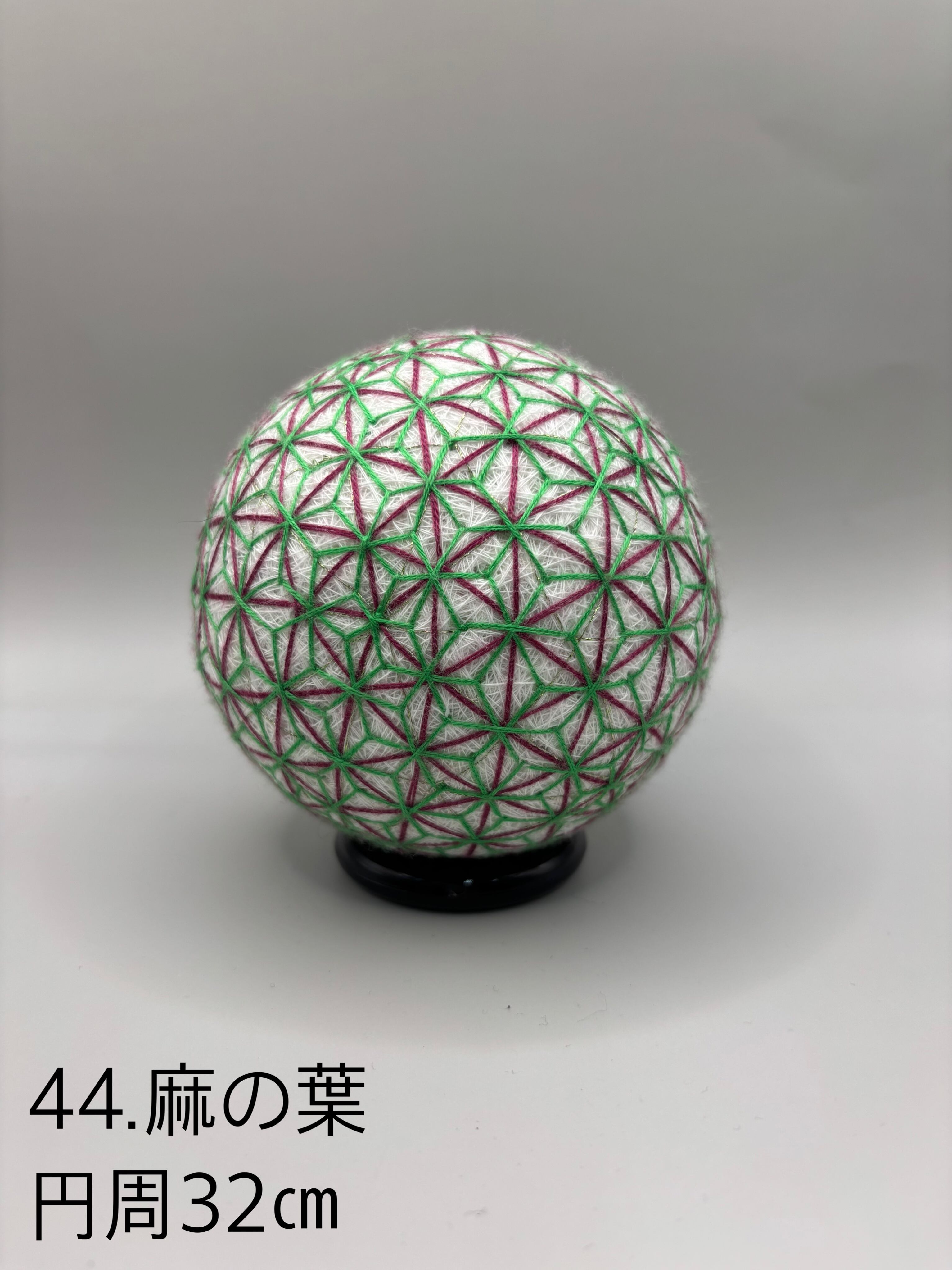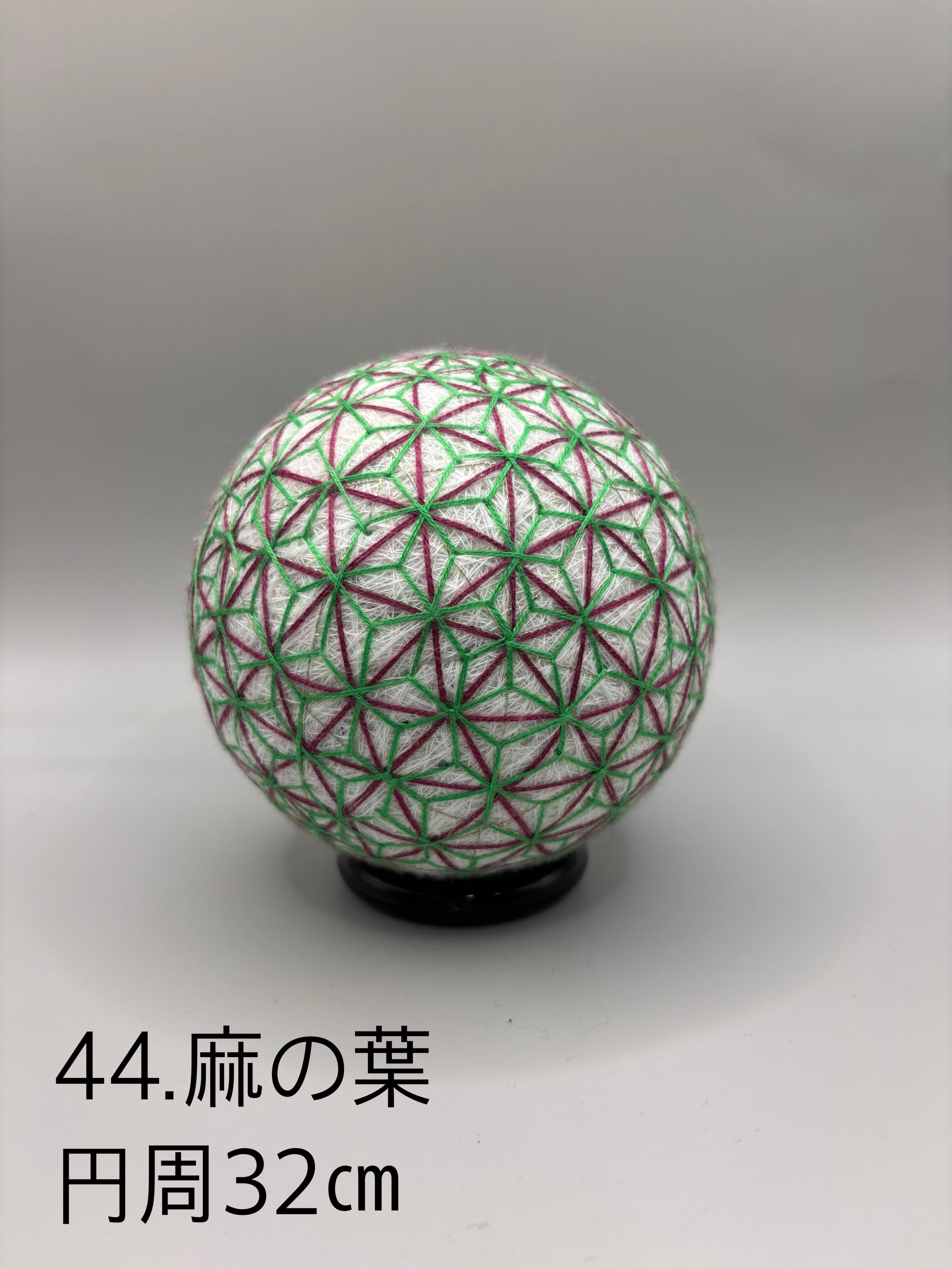 てまり糸で作られたこの作品は、円周約32cmの大きさで、シンプルでありながら力強い麻の葉模様をモチーフにした美しいデザインが特徴です。伝統的な日本の手芸技術を駆使し、麻の葉が持つ安定感と心地よさを表現した作品となっています。