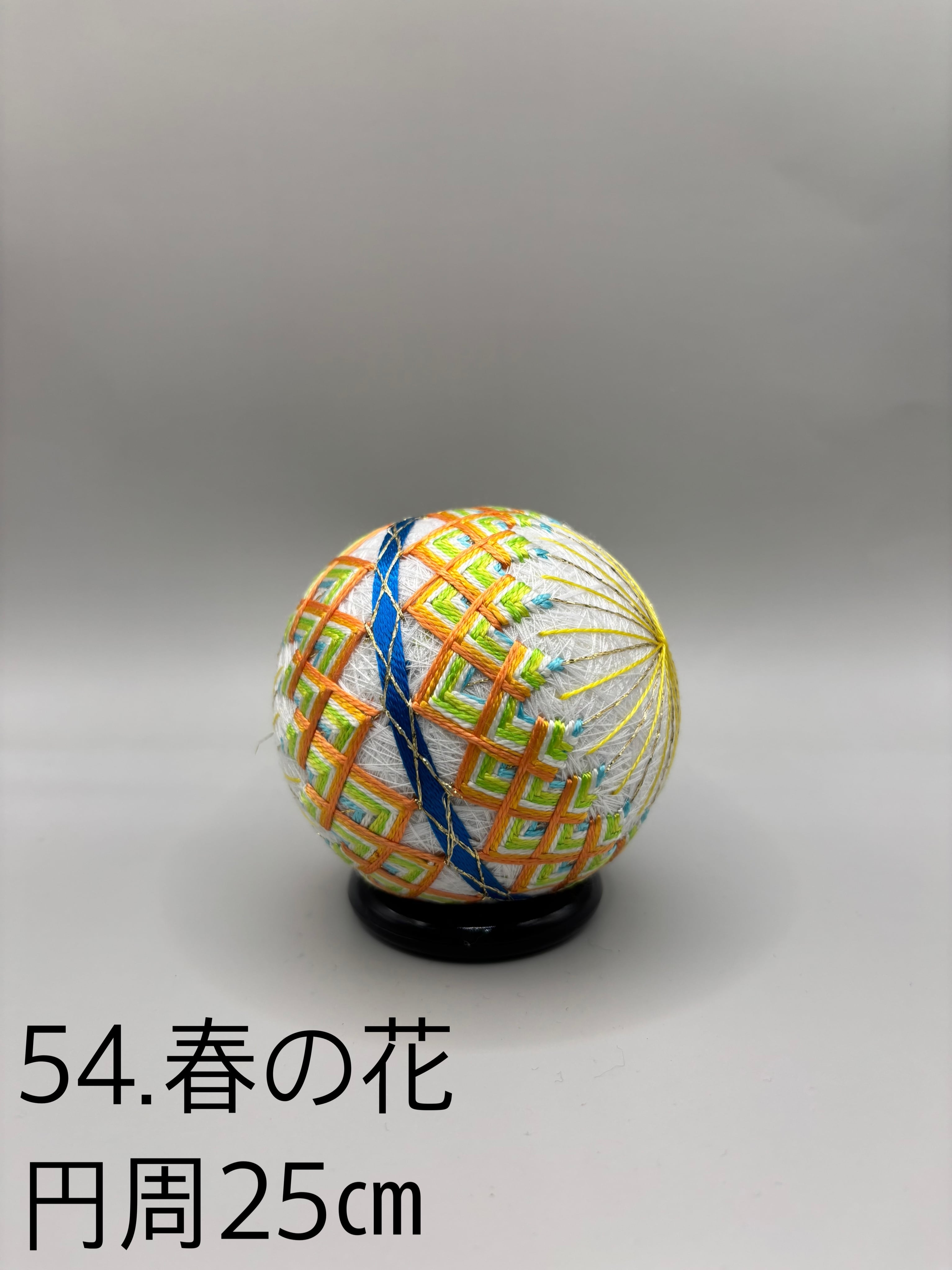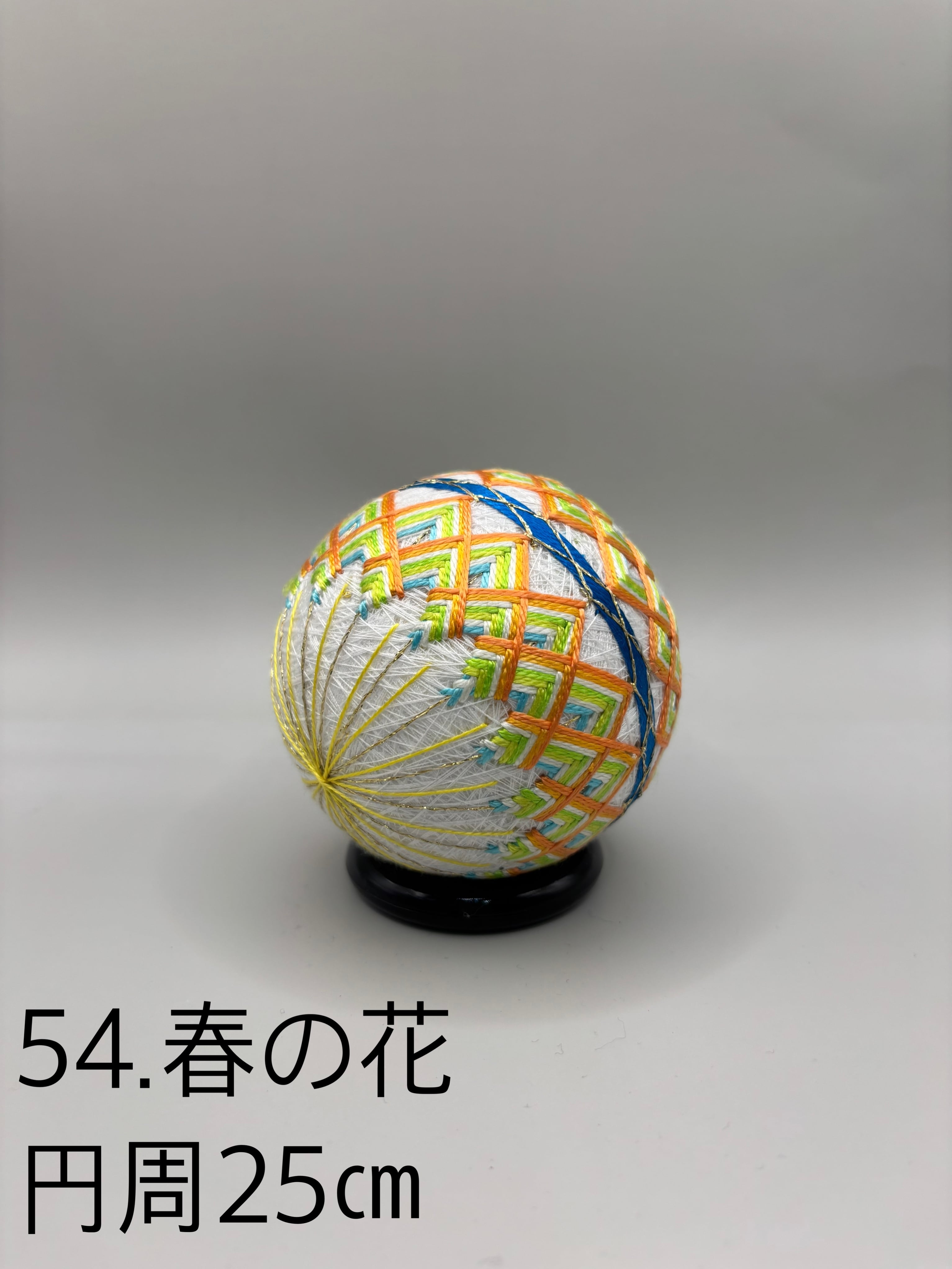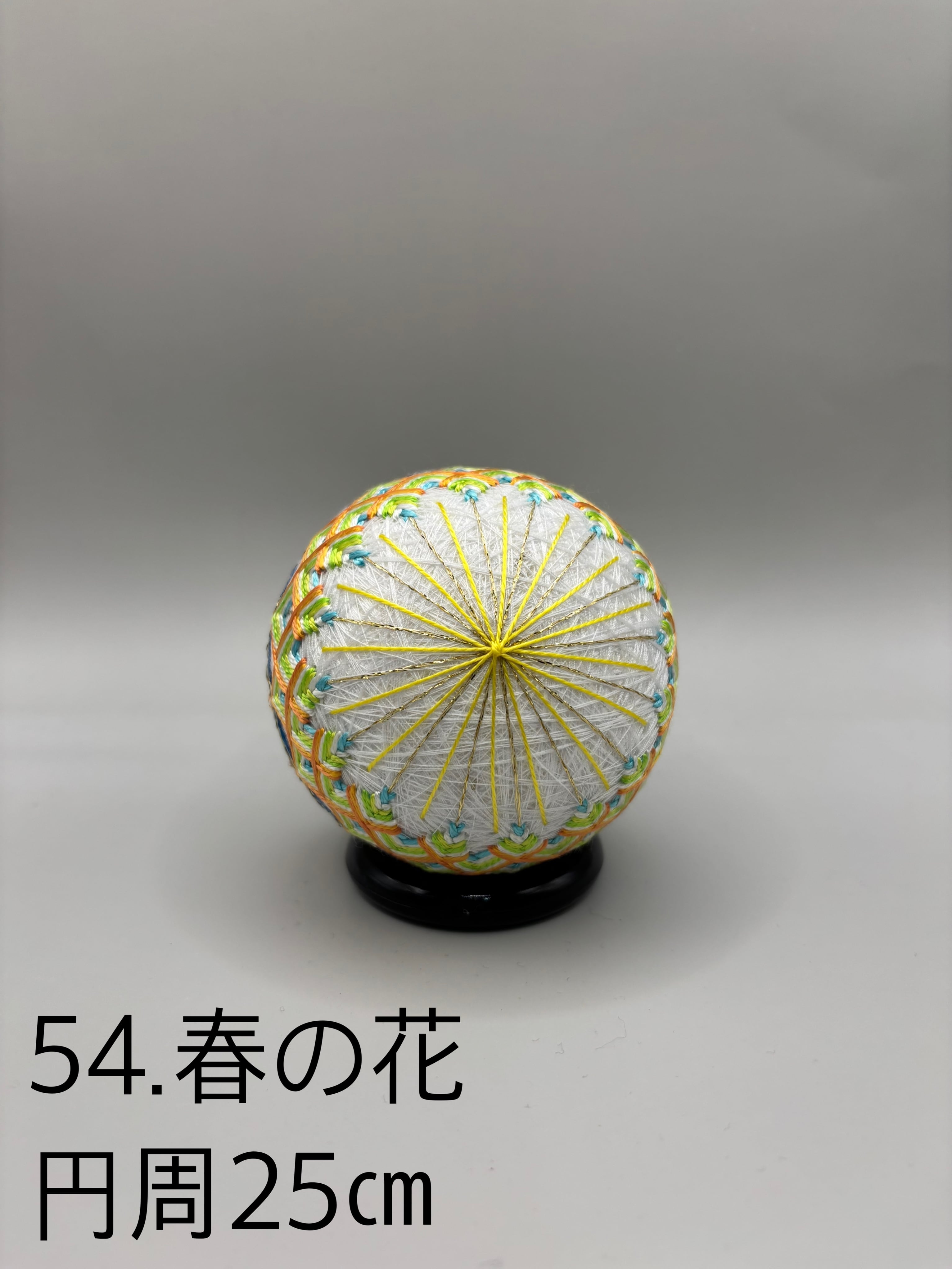「日本てまりの会」師範高橋紀代子が制作した、春の訪れを感じさせる「54.春の花」のてまりです。