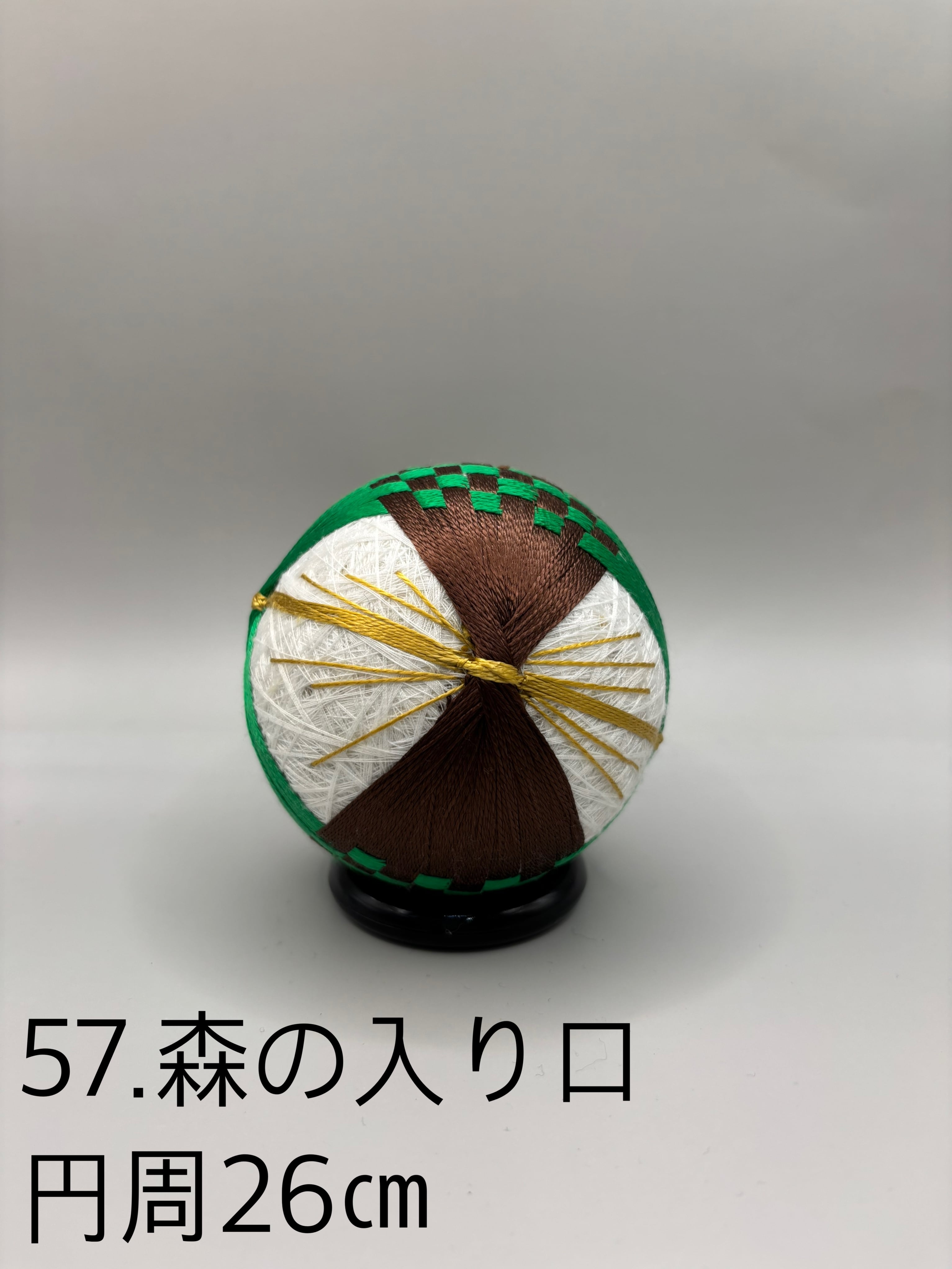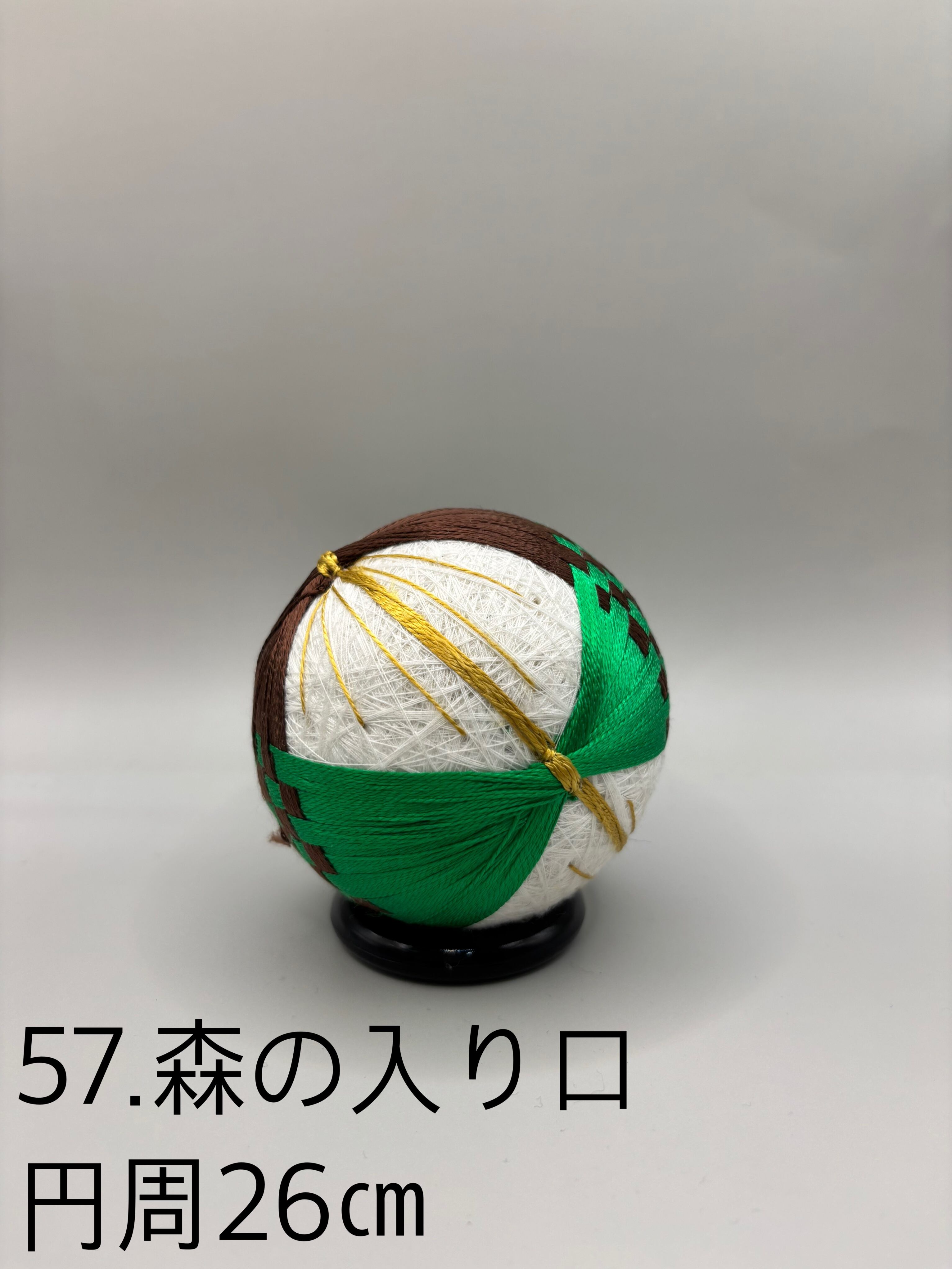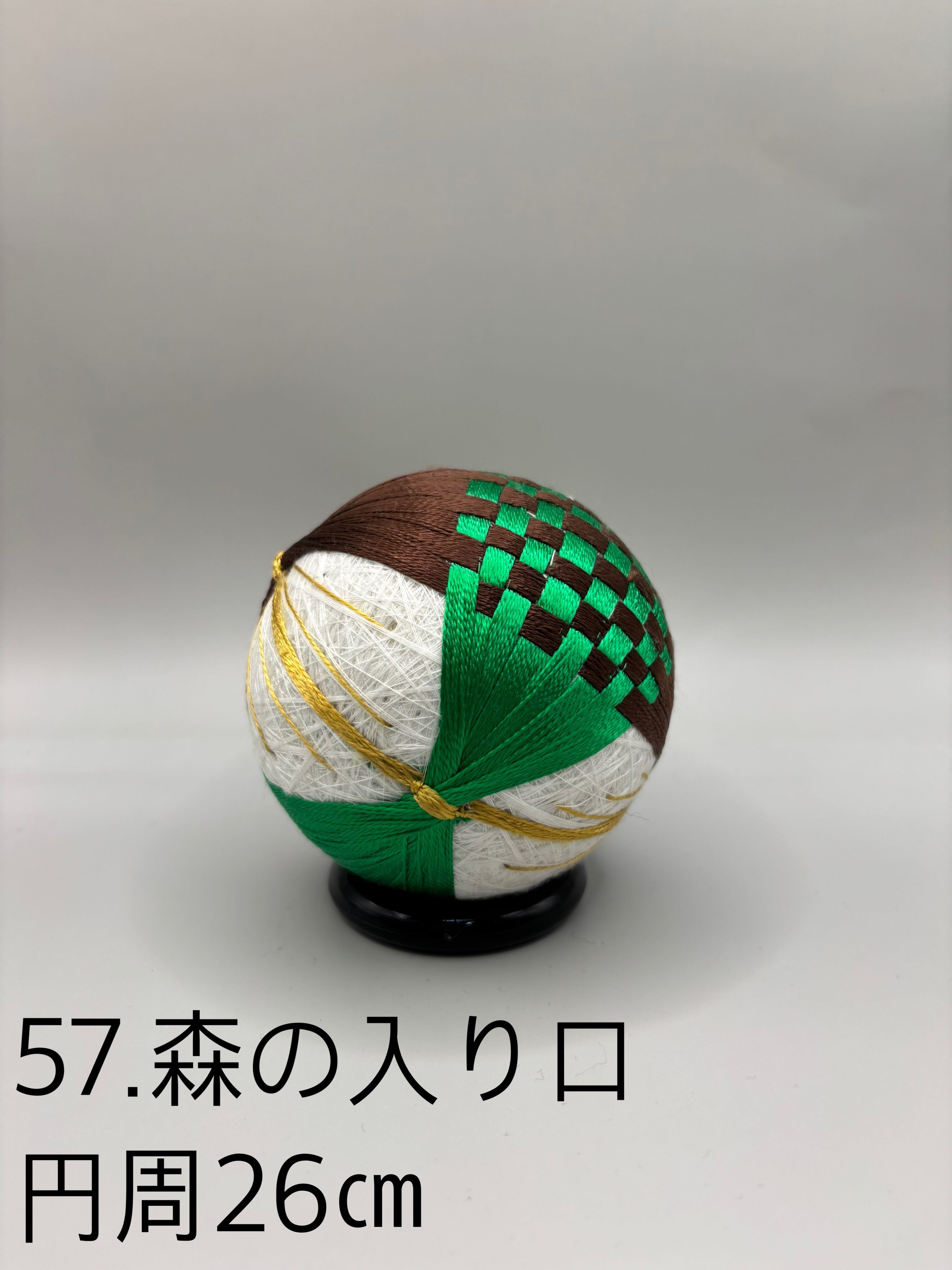「日本てまりの会」師範高橋紀代子が制作した、森の神秘と生命力を感じさせる「57.森の入り口」のてまりです。