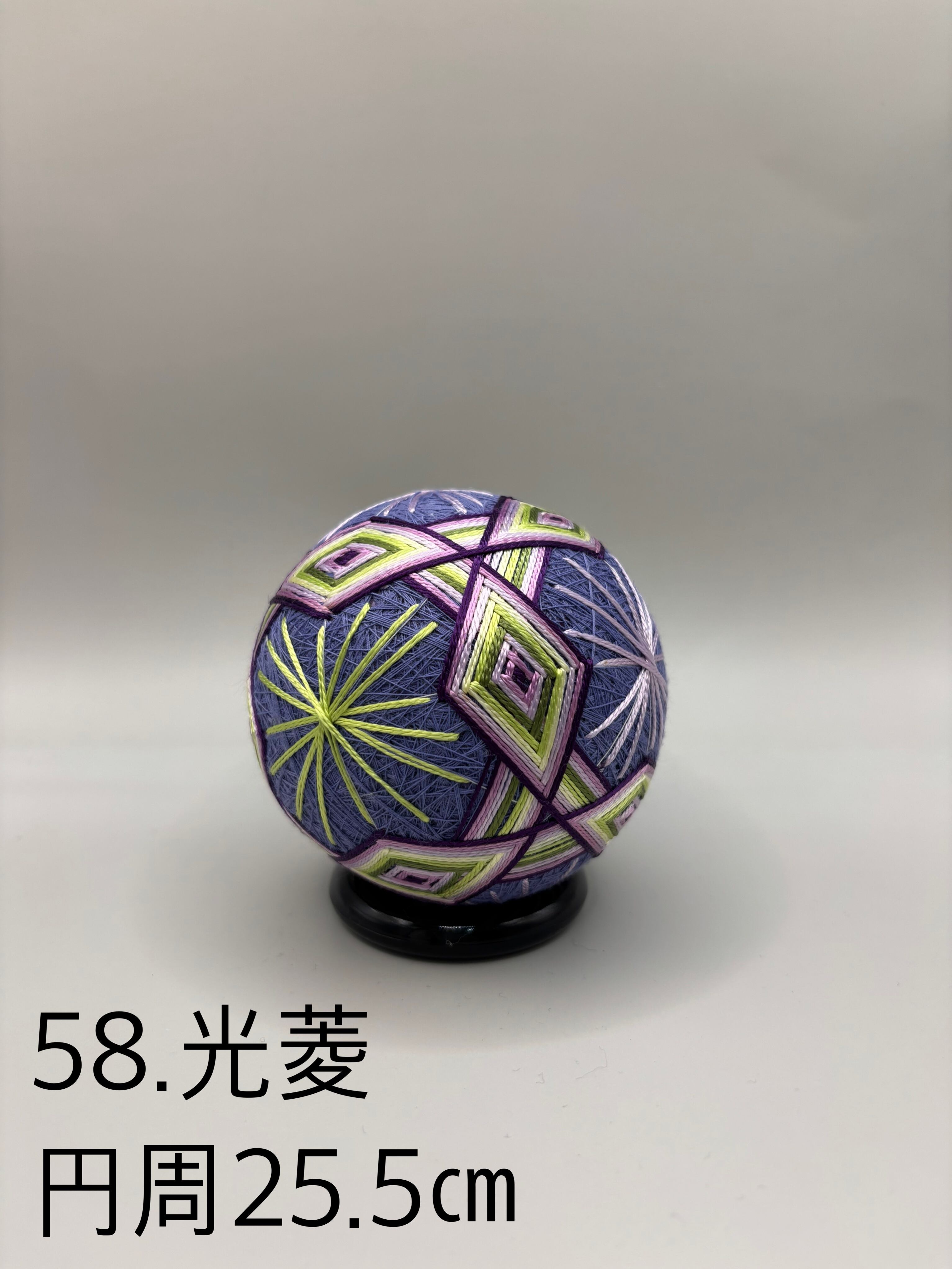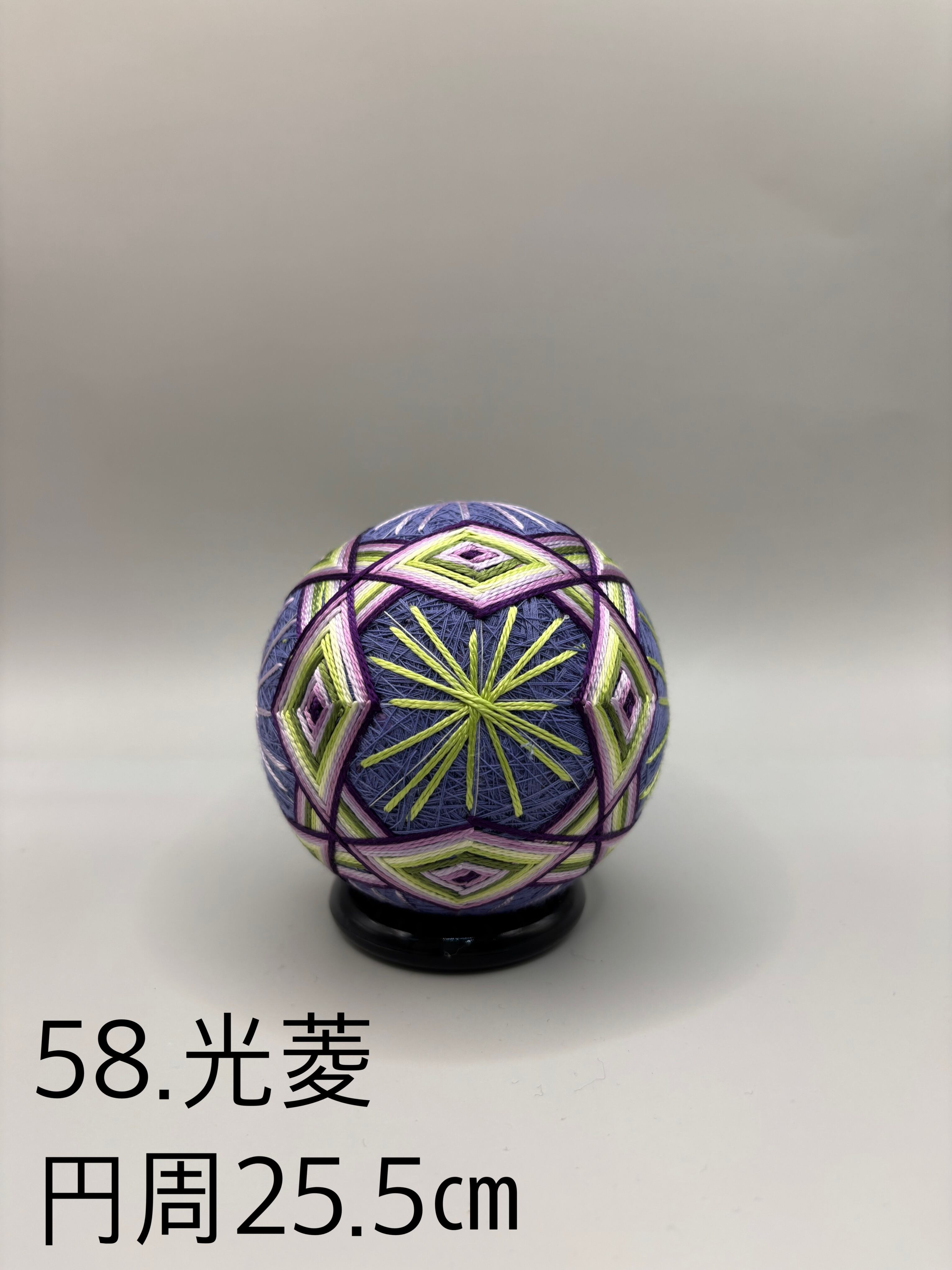 「日本てまりの会」師範高橋紀代子が制作した、美しい紫の「58.光菱」のてまりです。