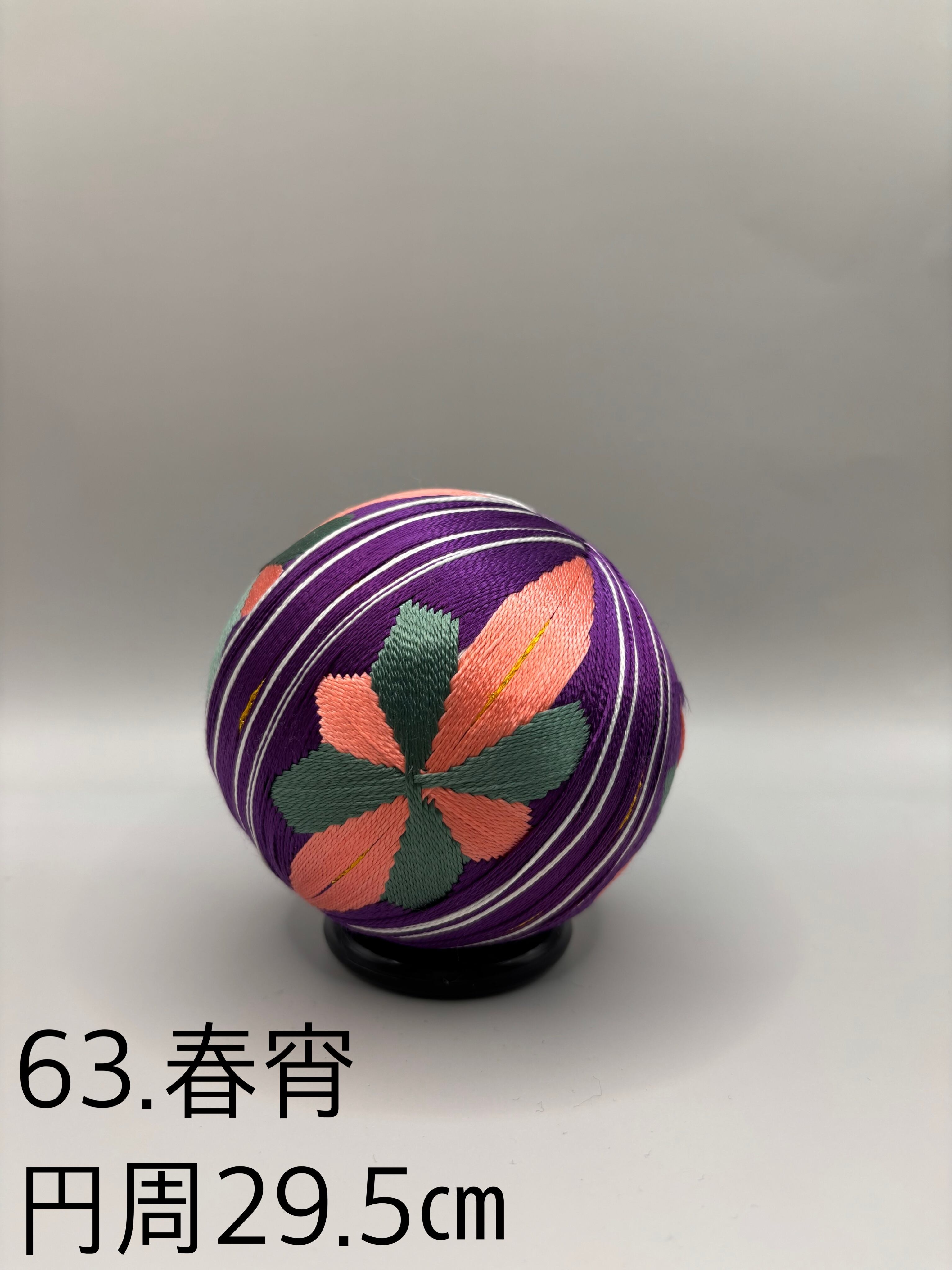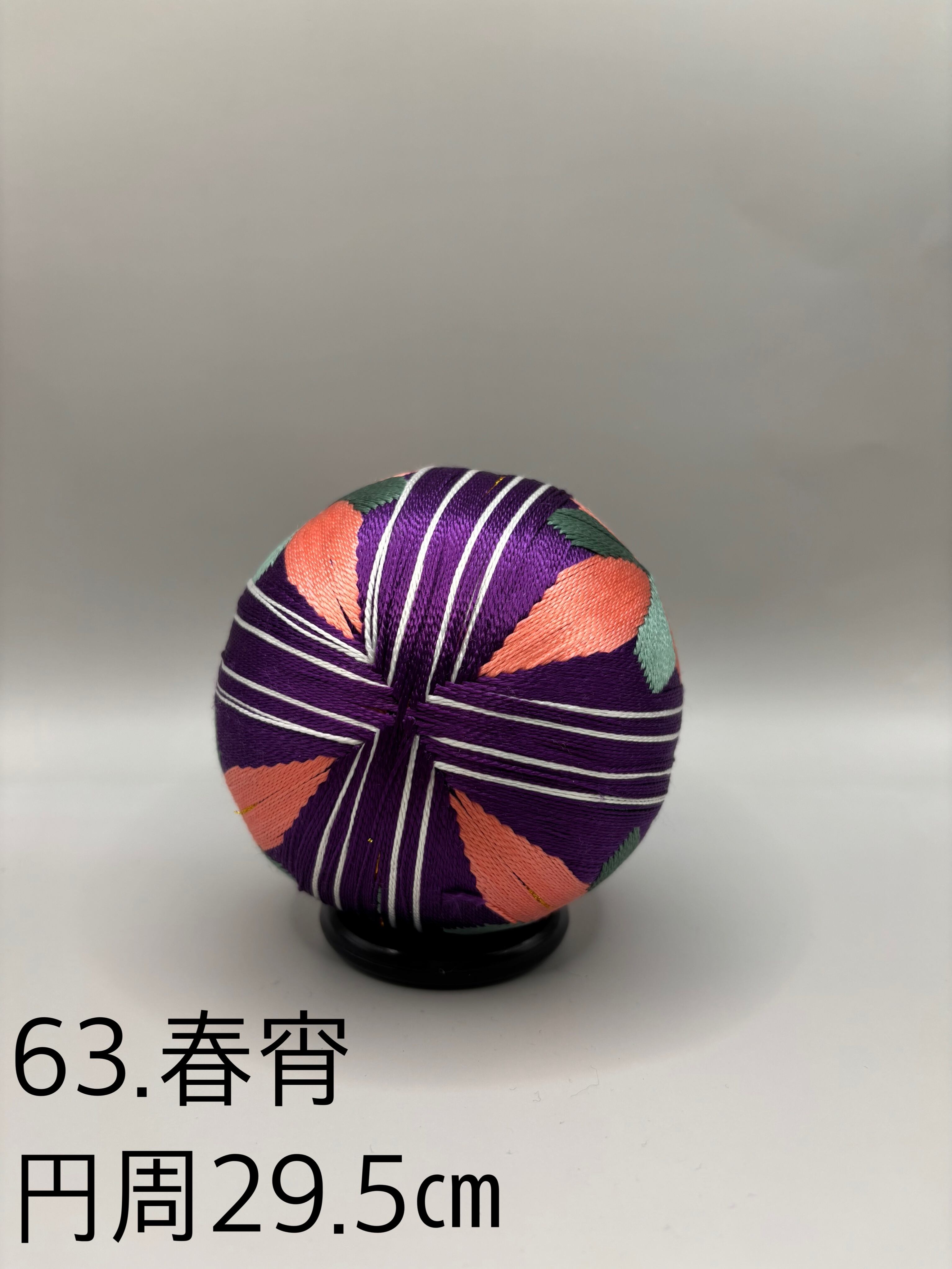 「日本てまりの会」師範高橋紀代子が制作した、華やかで夢幻的なデザインが魅力の「63.春宵」のてまりです。