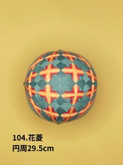「日本てまりの会」師範高橋紀代子が制作した、優雅で独特の美しさが際立つ「104.花菱」のてまりです。