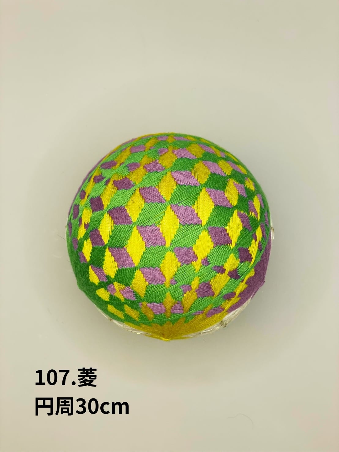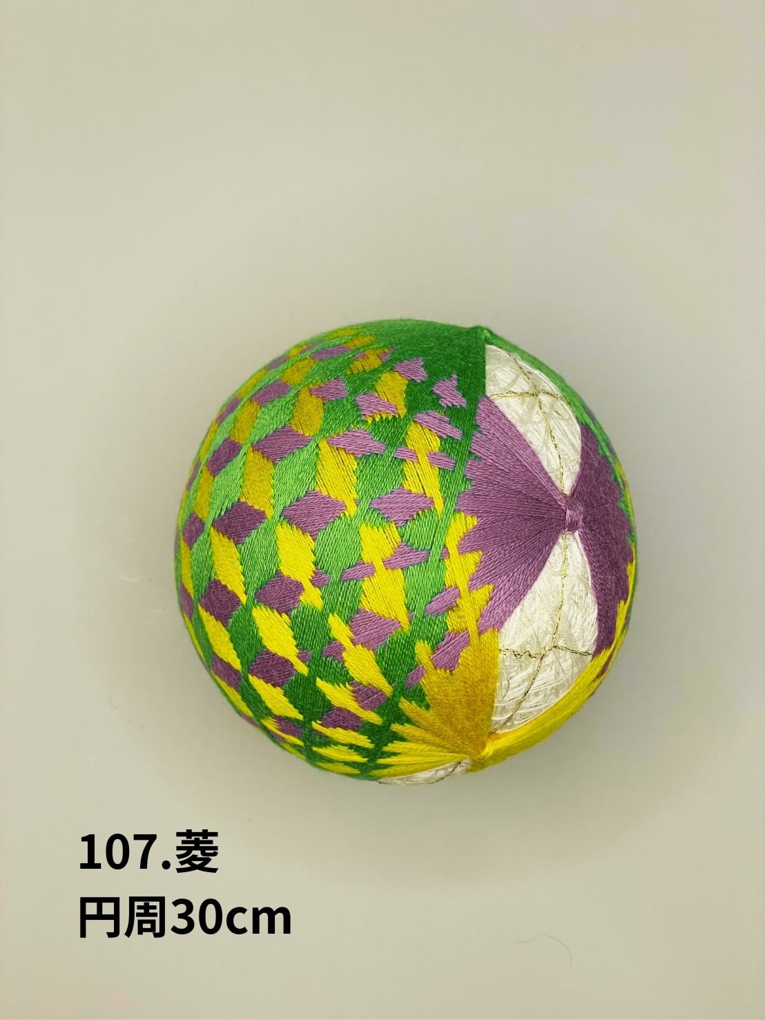 「日本てまりの会」師範高橋紀代子が制作した、優雅で独特の美しさが際立つ「107.菱」のてまりです。