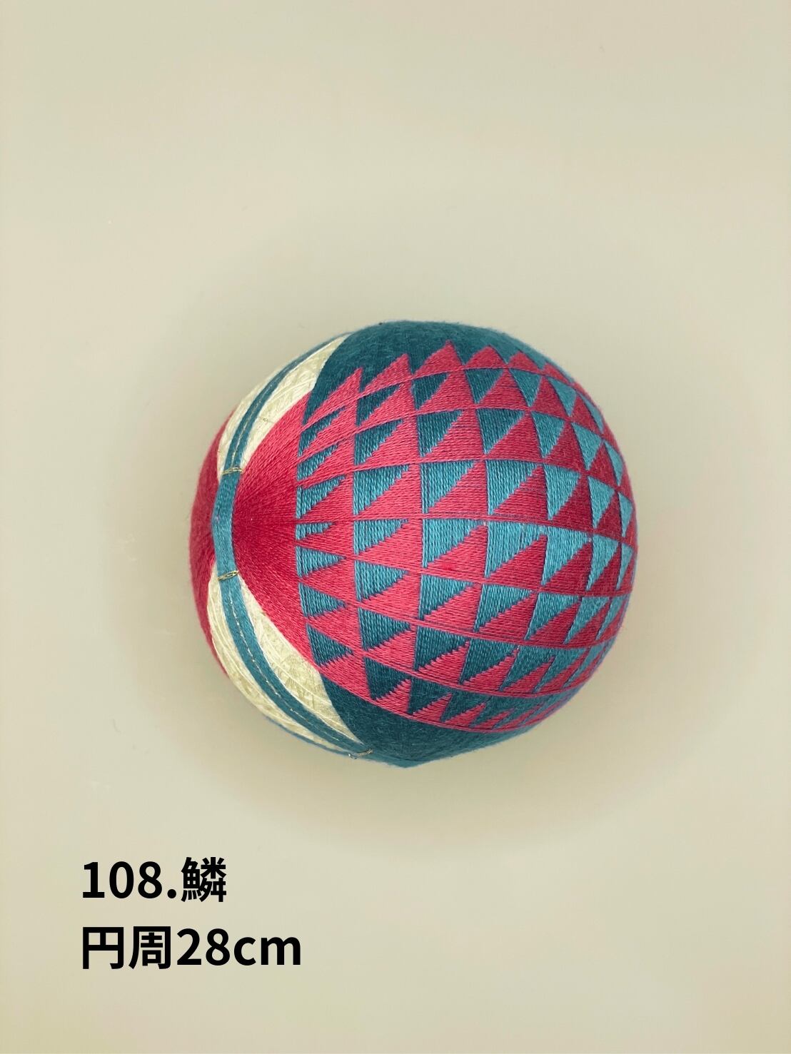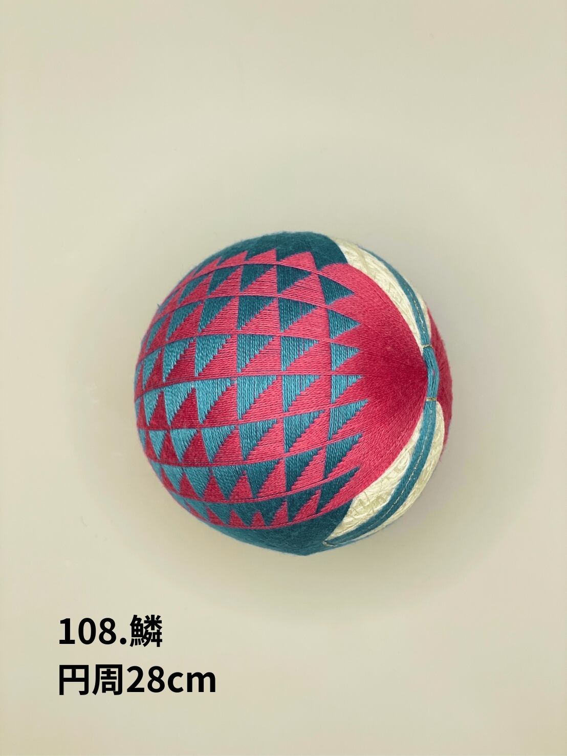 「日本てまりの会」師範高橋紀代子が制作した、優雅で独特の美しさが際立つ「108.鱗(うろこ)」のてまりです。