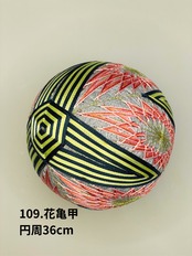 「日本てまりの会」師範高橋紀代子が制作した、優雅で独特の美しさが際立つ「109.花亀甲」のてまりです。