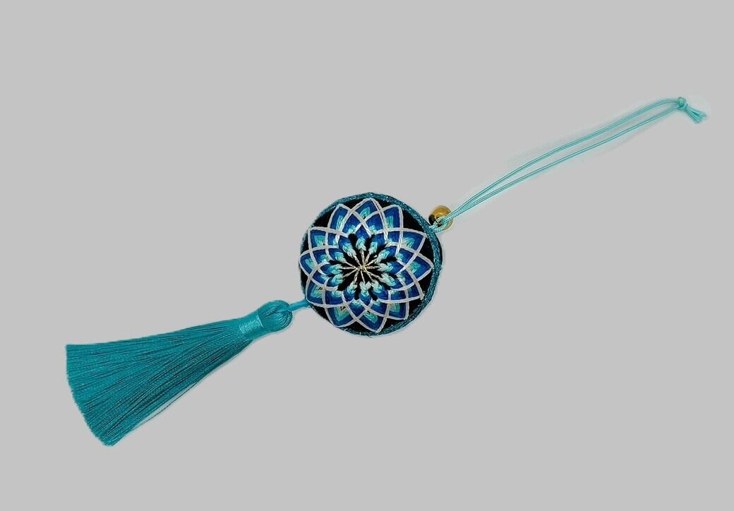 てまり糸で作られたこの作品は、円周約14cm・ふさ約8cm・全長約23cmのサイズで、華やかな花模様をテーマにした伝統的なデザインが特徴です。日本の伝統的な手芸技術を駆使し、花が持つ優雅さと鮮やかさを見事に表現しています。