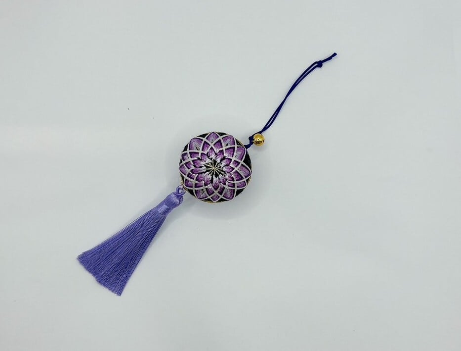 てまり糸で作られたこの作品は、円周約14cm・ふさ約8cm・全長約23cmのサイズで、古典的な模様をテーマにした伝統的なデザインが特徴です。日本の手芸技術を駆使し、魅力的な色合いと繊細な刺繍が見事に調和しています。