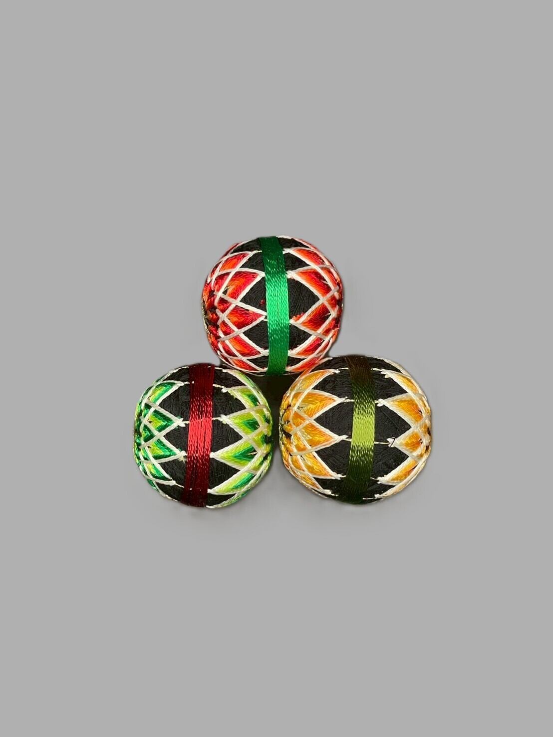 情熱(赤)、成長(緑)、繁栄(黄)をテーマにしたこの作品は、各円周約14.5cmのサイズで、伝統的な美しさと力強いエネルギーを感じさせるデザインが特徴です。日本の熟練した技術を生かし、鮮やかな色合いと精緻な刺繍が見事に調和しています。