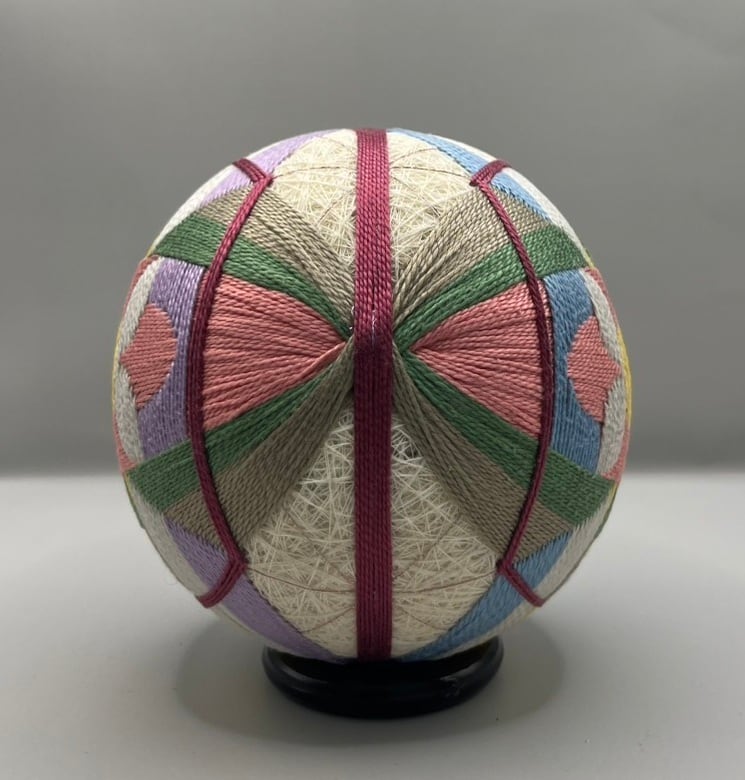 色とりどりの糸を使ったこの作品は、かわいい手毬のデザインが特徴です。円周約36cmのサイズで、日本の熟練した技術を生かし、春を感じさせる華やかな色合いと精緻なかがりが美しく調和しています。