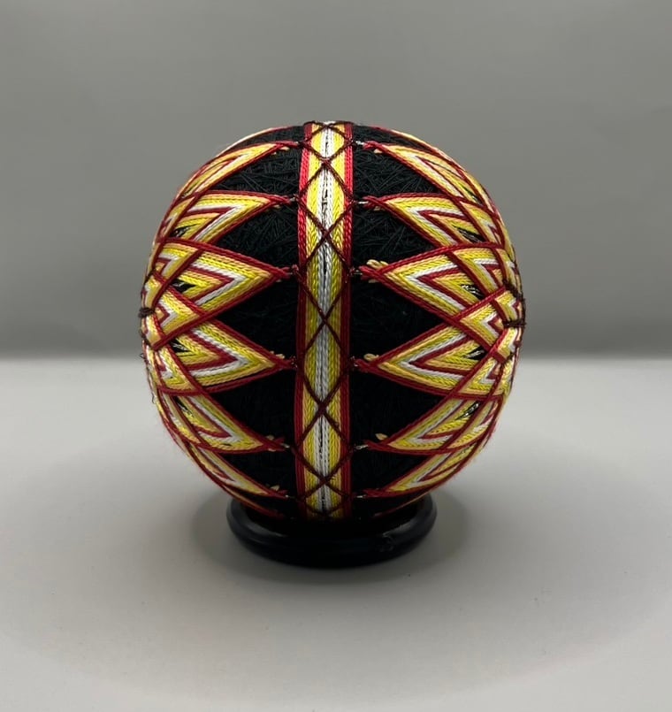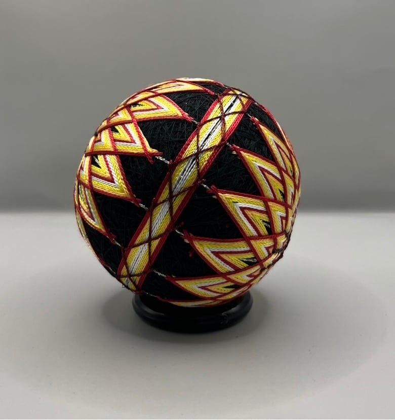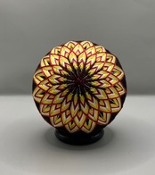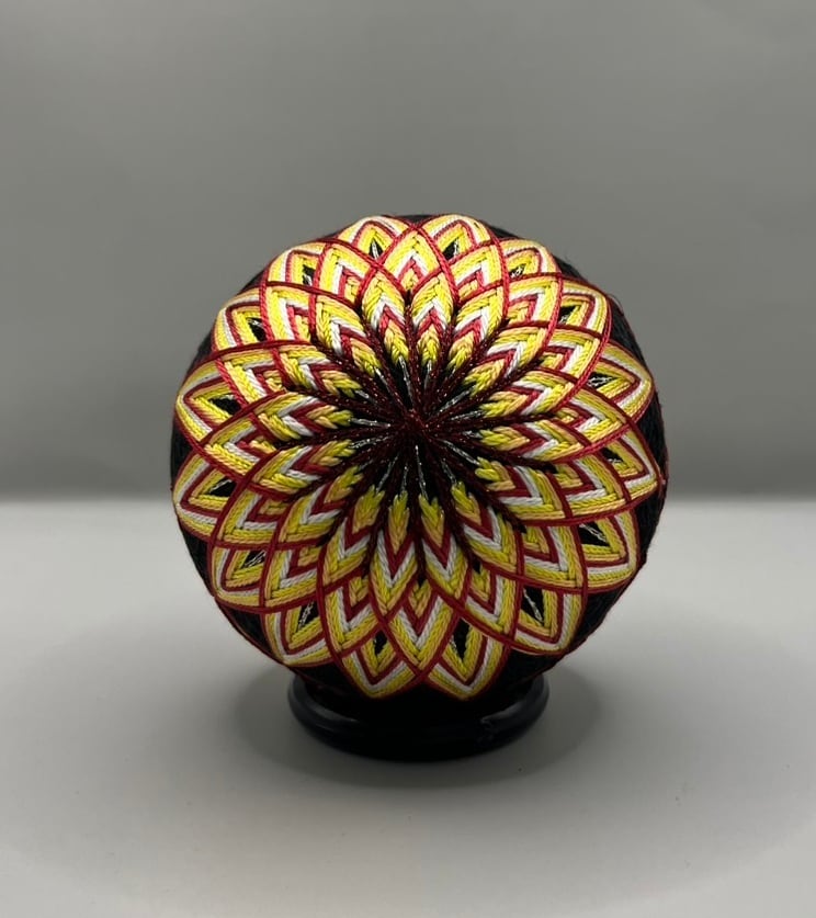 色とりどりの糸を使ったこの作品は、伝統的な菊模様をモチーフにしたデザインが特徴です。円周約31cmのサイズで、日本の熟練した技術を生かし、季節感を感じさせる美しい手かがりが施されています。
