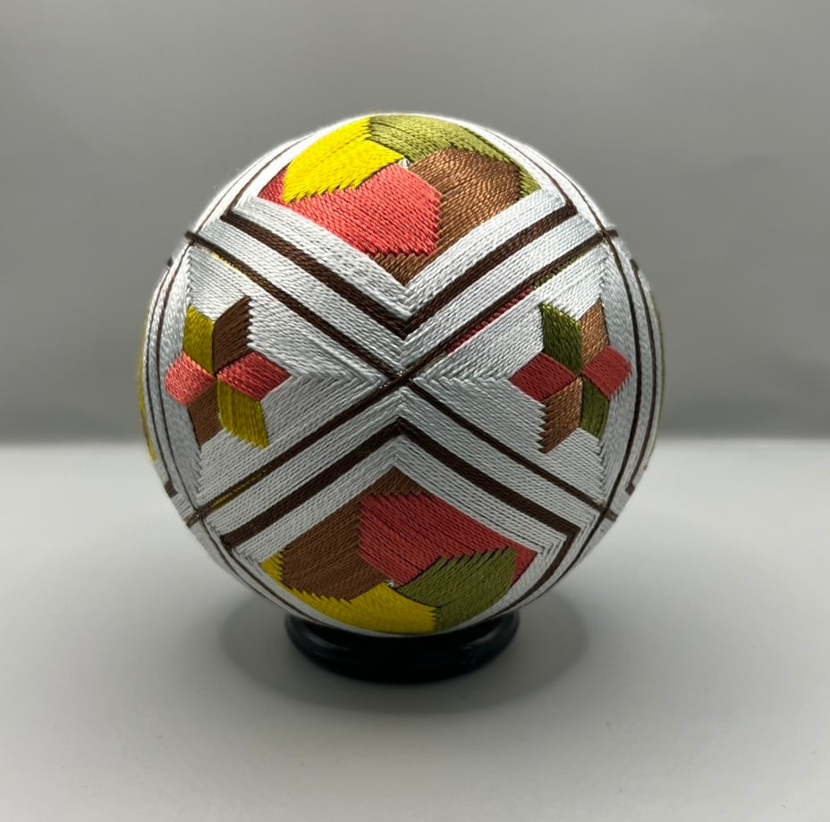 色とりどりの秋の色彩を表現したこの作品は、手毬をモチーフにしたデザインが特徴です。円周約34.5cmのサイズで、日本の熟練した技術を生かし、温かみのある美しい手かがりが施されています。